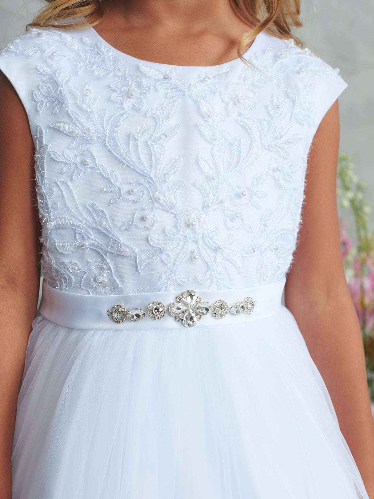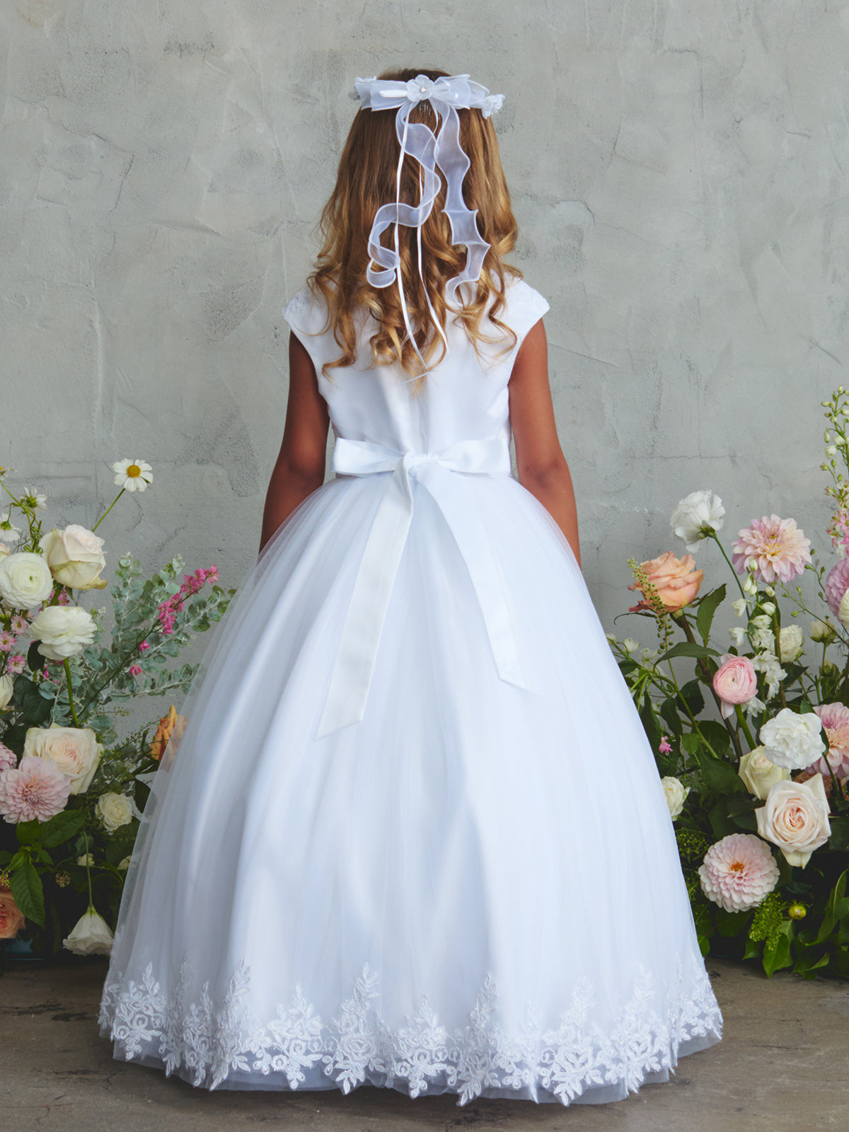 Graceful, elegant, and picture-perfect—this white lace and tulle dress is a dreamy choice for First Communion or as a flower girl gown. The fitted bodice features delicate lace embroidery with floral motifs, while...