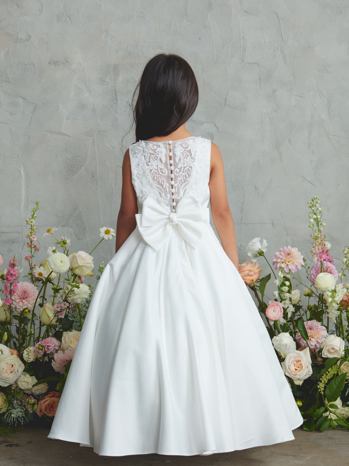 Make her special day truly unforgettable with this beautifully designed white dress, perfect for both flower girls and First Communion ceremonies. The front features a classic sleeveless satin bodice with delicate embroidery and a softly pleated full skirt for timeless charm.